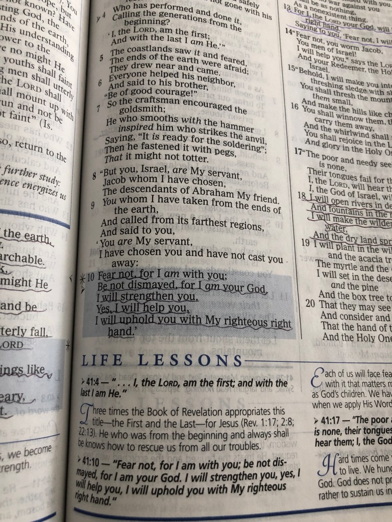 “Fear not; for I am with you; Be not dismayed, for I am your God, I will strengthen you, Yes, I will help you, I will uphold you with My righteous right hand.” -Isaiah 41:10