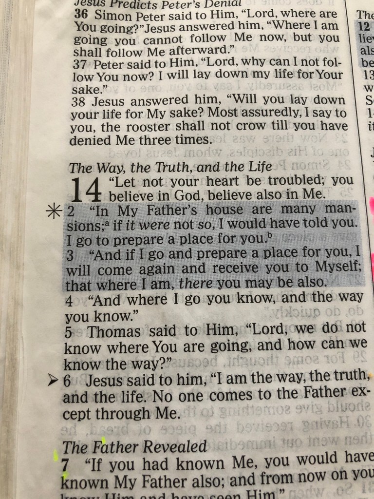 “Let not your heart be troubled; you believe in God, believe also in Me. In My Father’s house are many mansions, if it were not so, I would have told you. I go to prepare a place for you. And if I go and prepare a place for you, I will come again and receive you to Myself; that where I am, there you may be also. And where I go you know, and the way you know.”