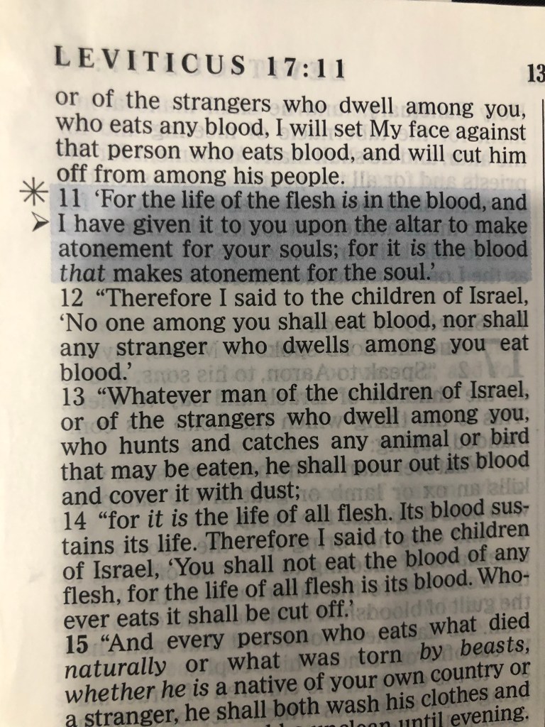 “For the life of the flesh is in the blood, and I have given it to you upon the altar to make atonement for your souls; for it is the blood that makes atonement for the soul.” Leviticus 17:11